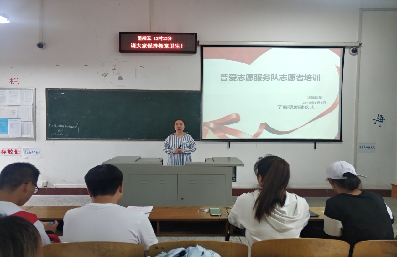 主讲人分别从“扶弱助幼,青春奉献;雷锋精神,青春聚力;治污降霾,青年行动”三个层次讲解了讲解了青年助残的内涵。讲解了“阳光助残”的内容。普爱志愿服务队作为全省志愿助残阳光基地,积极开展助残活动,践行阳光助残宗旨。主讲人还就如何与残疾人交往做了交流,如要称呼尊重、正常看待、注意语言回避和基本的礼仪等方面进行了培训。